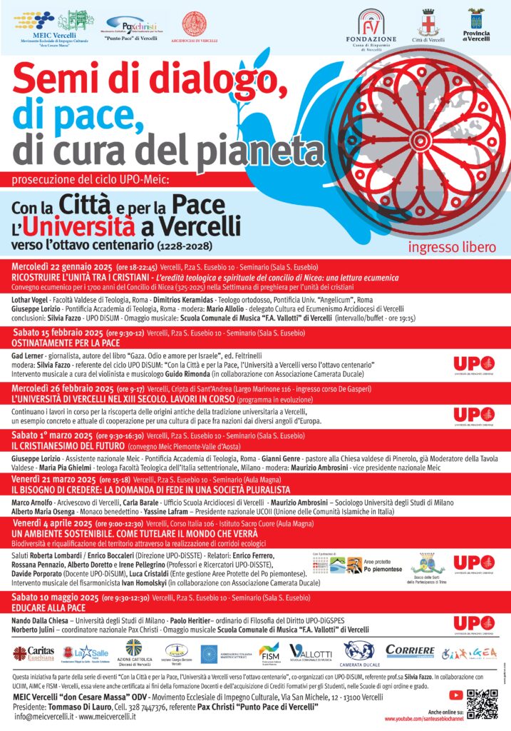 Prosegue il nostro cammino verso l’ottavo centenario dell’Università di Vercelli (1228), esso si propone di rinsaldare un impegno condiviso nella difesa dei valori fondanti della società civile: pace, giustizia, diffusione del sapere e salvaguardia dell’ambiente. In un contesto internazionale segnato da guerre e tensioni, avvertiamo l’urgenza di promuovere una cultura di pace, la coesione sociale e il rispetto dei diritti umani, con particolare attenzione alle nuove generazioni, anche perché la molteplicità dei conflitti in corso, di fatto sta pregiudicando il futuro e il diritto all’istruzione di milioni di bambini, adolescenti e giovani. Noi riteniamo che la diffusione del sapere, il dialogo interculturale ed interreligioso siano strumenti essenziali per favorire la convivenza pacifica in una società sempre più “plurale”. Le istituzioni scolastiche in questo senso si trovano ad affrontare sfide educative complesse, che richiedono la partecipazione attiva di tutta la comunità educante. La città, il territorio, le Istituzioni locali e le famiglie devono far parte di questa alleanza e il supporto umano e scientifico della Comunità universitaria è fondamentale in questo processo. Tutti insieme possiamo davvero sostenere la pace, proteggere l’ambiente e rinforzare la coscienza di un passato che rende insigne un territorio dove la cultura ha tradizioni antichissime. Quest’anno ricorrono i 1700 dal Concilio di Nicea (325) momento di dialogo e di incontro che apre il secolo più importante della storia culturale della cristianità: è il secolo IV stesso nel quale Vercelli, grazie al magistero di Eusebio, diviene per la prima volta centro propulsore di cultura. Per questo il ciclo di eventi per la Pace e per la riscoperta dell’antica Università a Vercelli, mette a tema speciale l’eredità di Nicea come esperienza di confronto e di dialogo. Anche quest’anno autorevoli relatori onoreranno il vercellese con la loro presenza.
