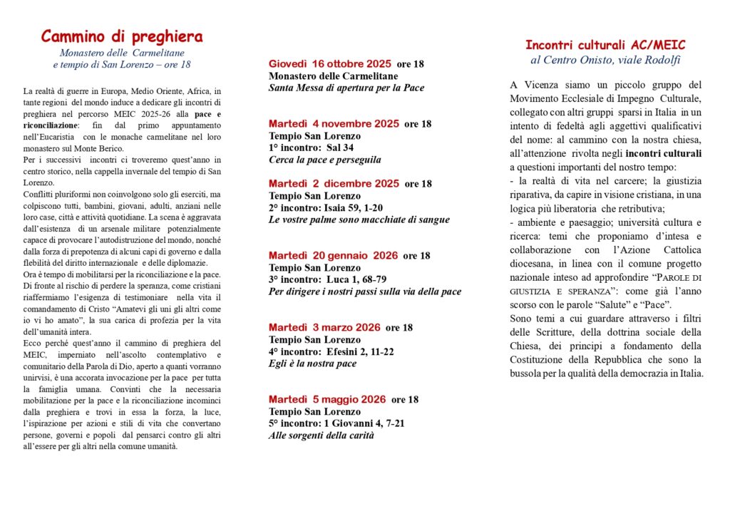 Da ottobre 2025, che si sta per concludere, a maggio 2026 il MEIC Vicenza propone un ricco cammino di incontri di preghiera e riflessione culturale, aperti a tutta la cittadinanza e ai fedeli della diocesi. Due i filoni che scandiranno l’anno: