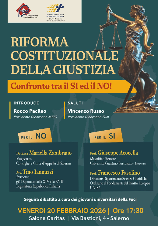 Oggi, di fronte al Referendum sulla riforma costituzionale della Giustizia, il Paese è diviso, impreparato, disinformato. Il compito di questo Convegno – che si terrà venerdì 20 febbraio alle ore 17:30, presso il Salone della Caritas di Salerno e organizzato dai Gruppi Diocesani MEIC e FUCI della Diocesi di Salerno – sarà quello di cercare di conoscere la sostanza di questa Riforma.