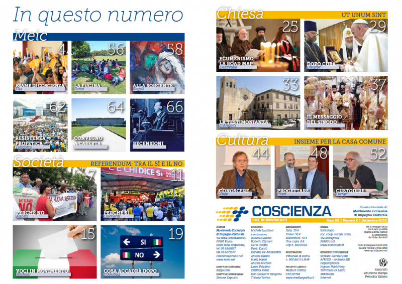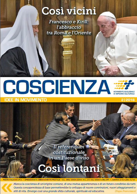 E' online il secondo numero della nuova Coscienza, imperniato su due temi cruciali ed attualissimi della nostra vita civile ed ecclesiale. Da un lato i nuovi sviluppi del dialogo ecumenico, a partire dallo storico incontro tra papa Francesco e il patriarca di Mosca Kirill. Dall'altro l'appuntamento ormai prossimo del referendum costituzionale del 4 dicembre e la profonda spaccatura che sta segnando la campagna fra le ragioni del "sì" e quelle del "no".